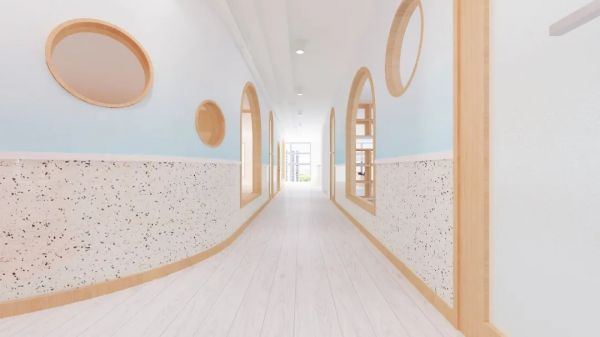 亲幼园的通道设计非常贯通,路路相连,自由串联,透明的橱窗设计将各划分空间的趣味横生一览无遗,根据孩子的空间尺度来设定尺寸,细节之处尽显用心。