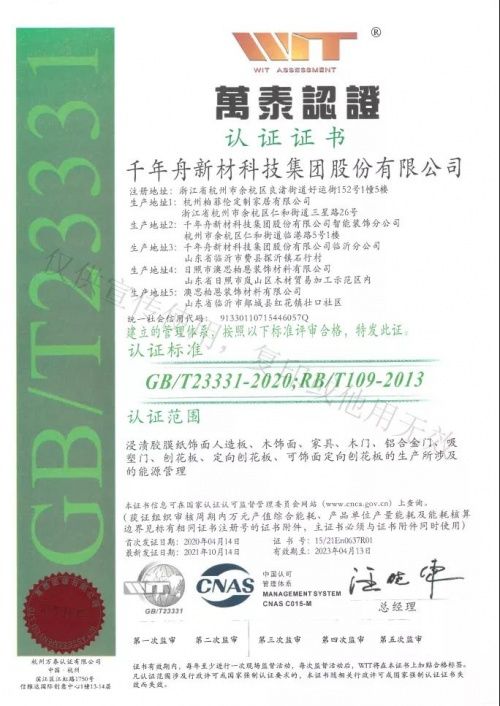 近日,千年舟集团浸渍胶膜纸饰面人造板、木饰面、家具、木门、铝合金门、吸塑门、刨花板、可饰面定向刨花板产品再次通过第三方权威认证机构审核,并获得「能源管理体系认证证书」!