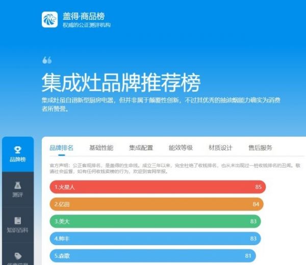 另外,从一组数据中也可以看出火星人的品牌优势。根据百度与盖得评测机构的数据,火星人长期占据集成灶百度搜索指数第一,盖得品牌推荐榜行业第一。