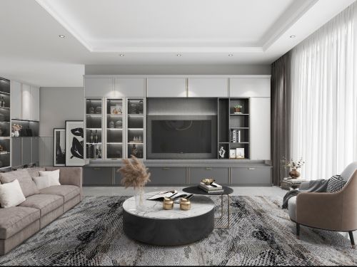 星之家雅·圣菲的客厅,以电视柜作背景墙,功能区域划分明确,整体布局匀称不呆板;柜门的描边设计,灰与白的沉稳撞色,结构与留白之间的联系,都予人以想象之余地,意蕴深远。