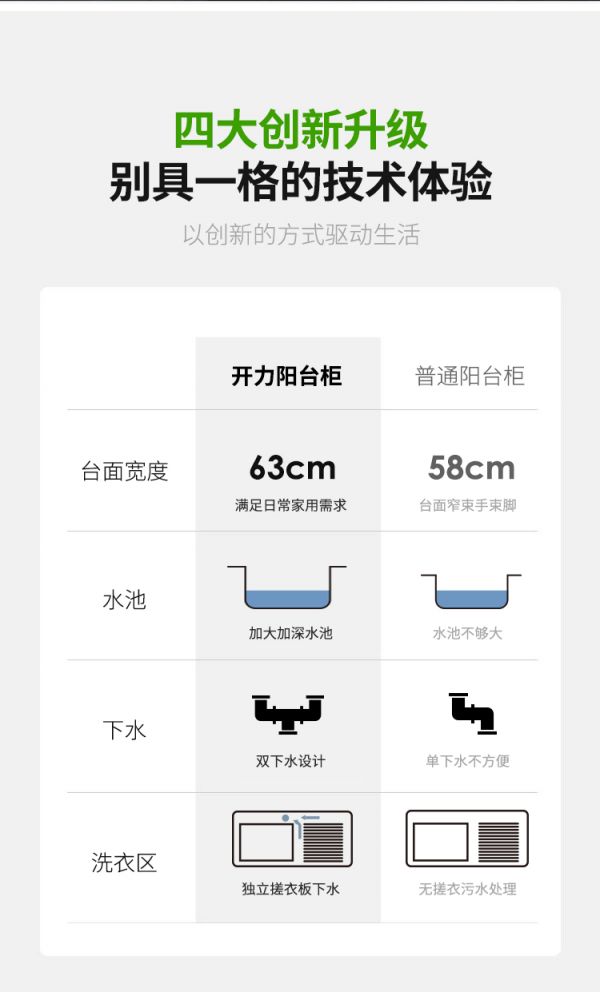 比起因为杂乱而不断抱怨的生活,用一个阳台柜去慧纳一生,颜值以外,阳台柜更讲究空间运用的智慧,有限空间内,科学有效的一体设计,开力不锈钢阳台柜,储物、洗衣、洗漱均能满足。