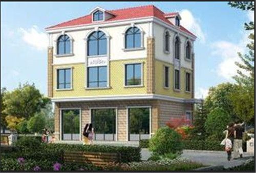 图纸描述:这是一款带底商的房屋,底层外墙采用了黄色的瓷砖进行装饰,这样既好看,又更耐脏,方便业主打扫卫生。而二、三层采用了绿色和白色涂料进行装饰,这样既时尚、亮眼,又能让房屋更有层次感。