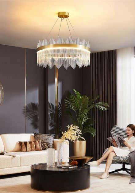 皇冠吊灯从冰雪皇冠中汲取创意灵感,复刻其华丽优雅的姿态,三色光圈搭配错落排列的水晶棒,仿佛西伯利亚纯净的冰晶,清透不含杂质。