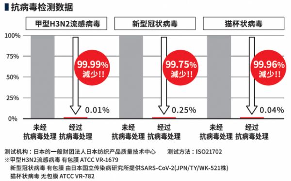 按照日本第三方机构SIAA制定的测试方法(ISO21702),对朝日木泰科的抗病毒地板进行了抗病毒性能测试,测试结果表明,经过24小时后,抗病毒地板与非抗病毒地板相比,抗病毒地板上的病毒减少超过了99%!该地板同时也对新型冠状病毒进行了测试,并证实对新型冠状病毒也有效!