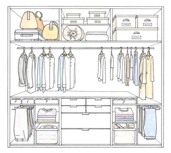 可以采用抽屉式的收纳空间,存放内衣和袜子等比较小的物品,而且这些物品都是比较常用的,采用收纳盒来划分,美观好找。