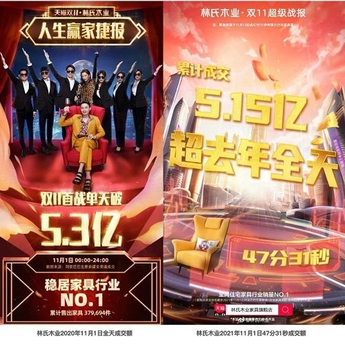 11月1日,在天猫双十一第一波售卖期中,林氏木业47分31秒累计成交5.15亿,官方宣称超过2020年11月1日全天成交额(但经新浪家具频道查证,去年林氏木业官方公布的首日成交额为5.3亿,并未超过),全网住宅家具行业类销售第一。