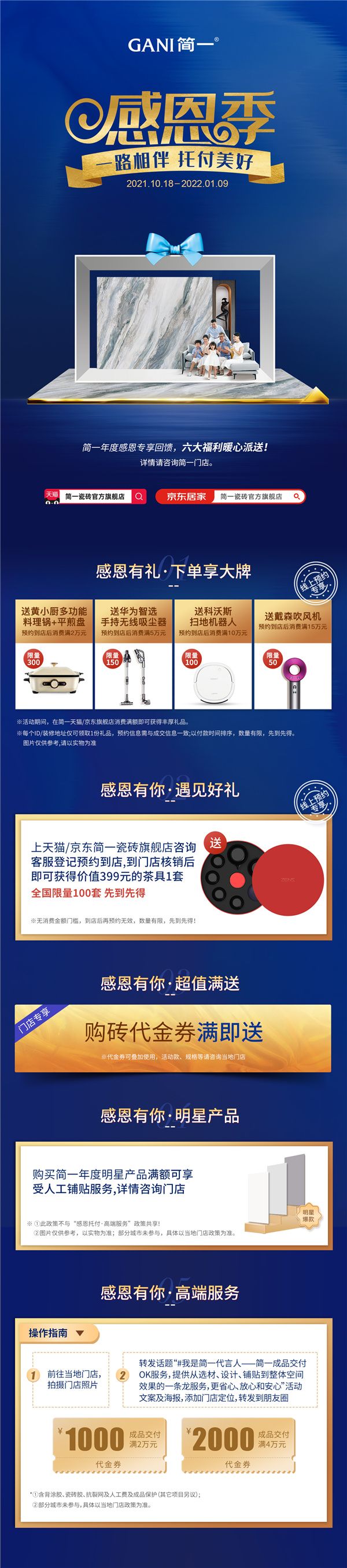 感恩季期间,简一特别推出六大暖心福利,购买明星产品享受铺贴服务、成品交付满2万送1000元代金券,还有华为吸尘器、戴森吹风机等丰厚礼品暖心大派送。详情可关注简一天猫旗舰店或京东旗舰店,或前往简一门店咨询。