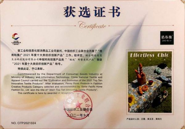 10月21日,“培育和推广2021年度十大类纺织创新产品”颁奖典礼在盛泽举行,中国纺织工业联合现场发布了2021年度十大类纺织创新产品名单。明远创意生活旗下品牌造布集出品的“佩妮”野餐系列产品被授予2021年度十大类纺织创新产品称号。