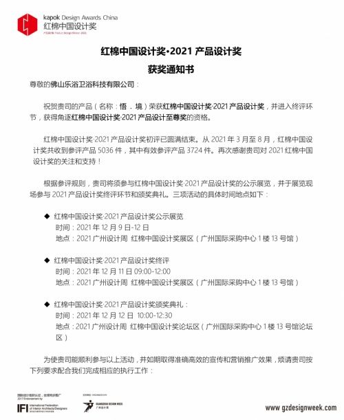 喜报|佛山乐浴科技有限公司连续2年荣获红棉奖·产品设计奖