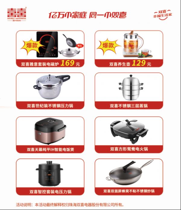 珠海双喜电器股份有限公司(简称“双喜电器”)品牌旗下覆盖压力锅、电压力锅、电饭锅、炒锅及各类小家电等多种品类产品。对于不同类型的消费群体,双喜电器力求可以更全方位地应对大众所需,升级产品,突出个性。从品质、功能、外观等方面不断突破,提升产品的品质,持续推出适应消费者和市场需求的智能化厨房电器及小家电。