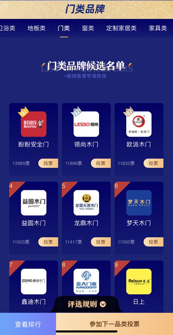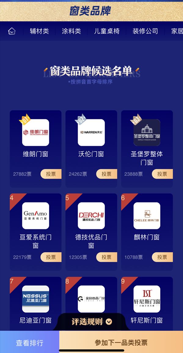 经候选品牌公示环节后,陶瓷、卫浴、厨电、地板、门类、窗类、定制家居、家具、辅材、智能家居、舒适家电、儿童桌椅、家居卖场、装修公司共计十五大品类已经于10月27日正式进入投票环节,本次网络投票为期7天,自10月27日零时起至11月2日24时止,在全国范围内同步展开。