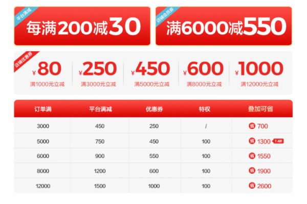 预售期间0.1元购买特权礼包,11月1日当天付款即有机会享受0.1元抵100元优惠,还可同时叠加平台满200减30、店铺大额优惠券(如满5000减450、满8000减600等)一系列钜惠福利,让“省薪”一步到位!