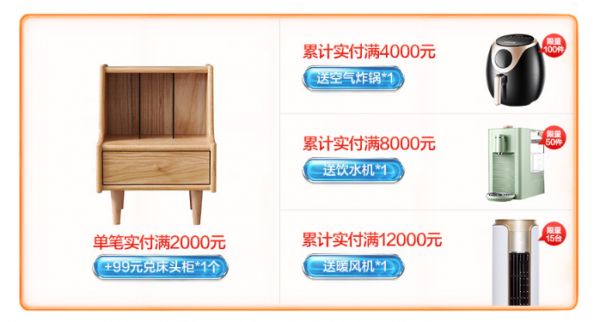 买家具,送家电!11月1日~3日期间,累计支付达到一定金额的消费者,即有机会获得空气炸锅、饮水机、暖风机等品质家居好物,让居家生活更方便。