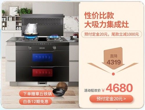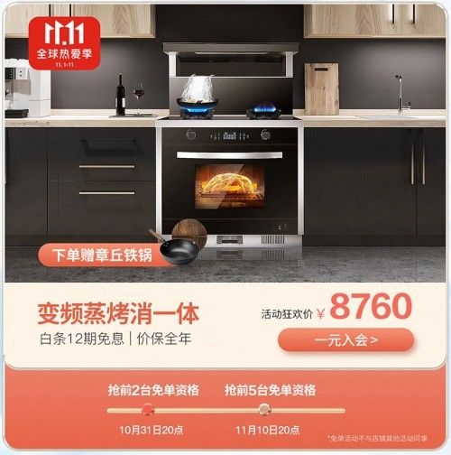科恩集成灶双11爆款抢免单,新一代变频蒸烤消一体集成灶,八大烹饪模式蒸烤合一,集成灶选变频,更省心!D151X变频大吸力蒸烤消一体集成灶双11狂欢价8760元,11月10日20点前5台下单就有机会免单;