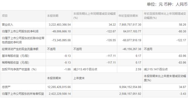 报告显示,第三季度三棵树涂料股份有限公司实现营业收入32.22亿元,同比增长34.22%;归属于上市公司股东的净亏损为4900.67万元;基本每股收益为-0.13元/股。