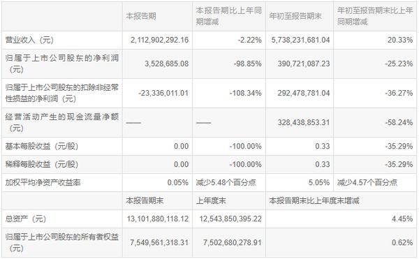 报告显示,第三季度广东东鹏控股股份有限公司实现营业收入21.13亿元,同比下降2.22%;归属于上市公司股东的净利润353万元,同比下降98.85%。