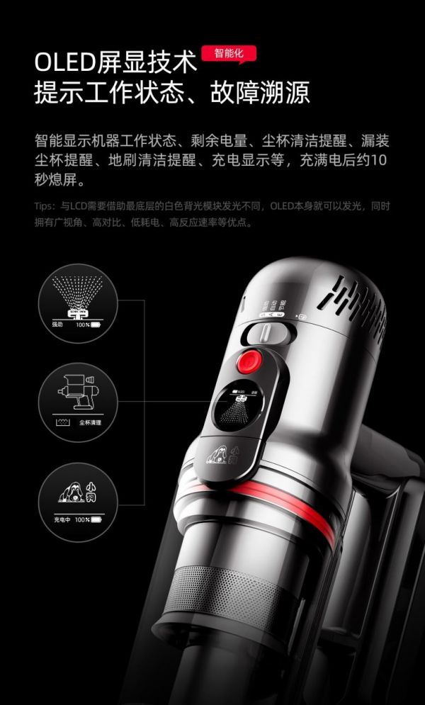 它还内置智能数字化除尘系统,通过红外线分析气流中的微尘数量,在自动档清洁模式下自动调节功率大小,灰尘越多吸力越强。同时用户可以通过OLED显示屏实时查看机器的工作状态、剩余电量等信息,面对复杂的清洁场景也有的放矢。此外,小狗吸尘器的智能数字化除尘系统适用于全系任意刷头,可最大化发挥吸尘能力。