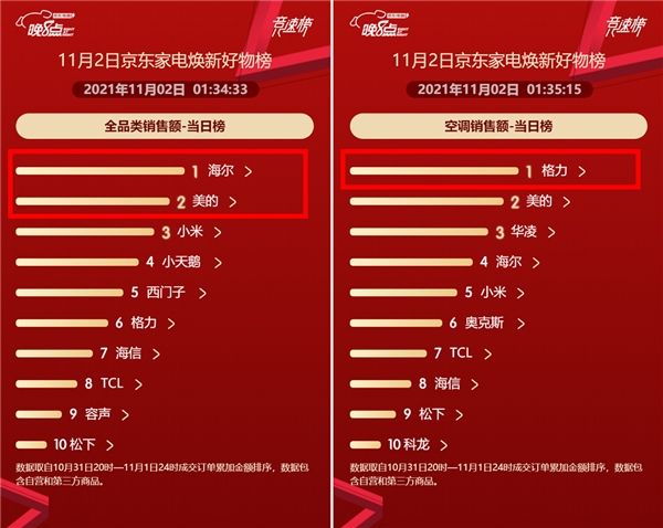 截止11月1日24时,海尔、美的稳坐京东家电开门红全品类销售额第一、第二名,体现了极强的综合品类能力。格力力压群雄抢占“空调销售额”榜单N0.1;另外像方太、九阳、科沃斯、戴森等“专攻”某一领域的品牌也在排行榜中取得了优秀的成绩。