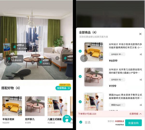 除了构建场景为消费者描绘理想客厅外,京东11.11期间,京东居家还通过搭配购、省心装等服务全面助力消费者客厅空间升级改造。基于休闲客厅、爱宠乐园、萌娃客厅、收纳客厅、运动客厅等各场景特性,京东居家将适配相关空间风格的居家单品组合搭配在一起,消费者可在京东一键下单,一站购齐客厅空间搭配组合。