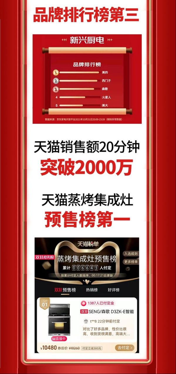 天猫方面,森歌D3ZK-E蒸烤集成灶天猫精灵款在天猫预售榜单中连续五天占据榜首,最后更夺得集成灶预售榜、蒸烤集成灶预售榜双榜销量冠军,足以见得消费者对它的认可与对森歌的信赖!11.11还未结束,森歌的海联福利优惠还在持续进行中,还在犹豫剁不剁手集成灶的小伙伴们,快趁现在来森歌集成灶三大线上门店参与惊喜狂欢吧!