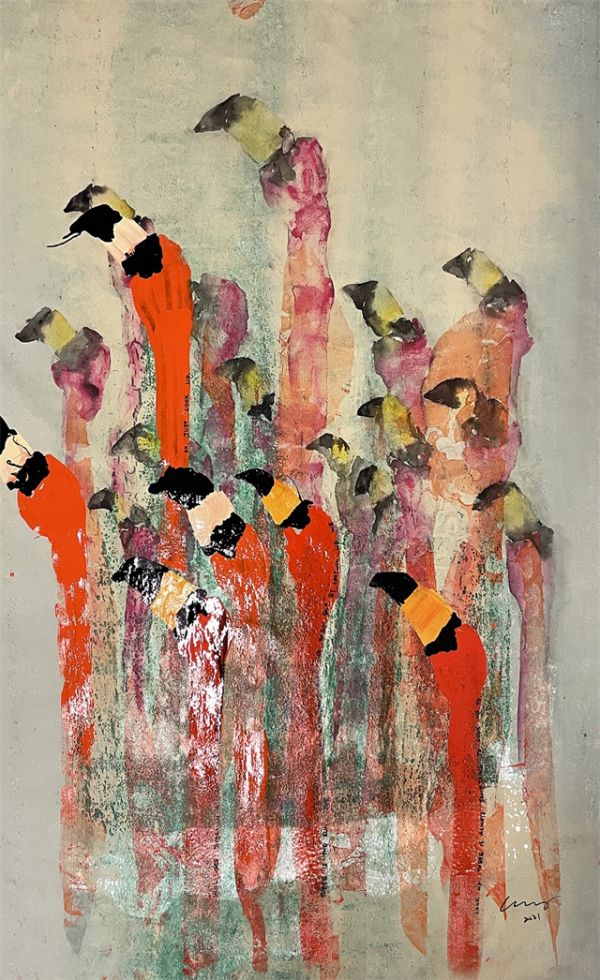 「梦系列」以不同色彩传递当下情绪,当情绪的变化从释放趋向稳定,心中就出现了过去遗忘的梦,更多表达的是模糊、挣扎、幻想甚至嘶吼。「光系列」撕裂画面的金漆,象征现世的破碎与万物的残缺,在后疫情时代里怀抱盼望,憧憬温柔生活的向往。如光系列之《从我的位置看世界》,用动物代替自己去表达,“在我的位置上倾听自然的声音,在我的位置上,看着世界在黑暗中休息,在光明中觉醒,这不仅是我的位置,也是你的”,将这般温柔的憧憬散去远方。蒋友柏说过“梦是易碎的,所以光才能进来”,所以,此次画展亦是他从梦到光的一个旅程。