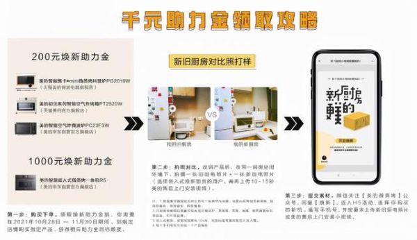 这个双十一,美的推出了#新厨房 更美的#厨房焕新活动。只要你的家中有老旧微波炉、烤箱、蒸烤箱、微蒸烤复合机,即日起至2021年11月30日,前往指定店铺拍下指定产品,收货后上传同一场景下新旧厨电照片,就能领取最高千元焕新助力金!厨电焕新再也不用精打细算。