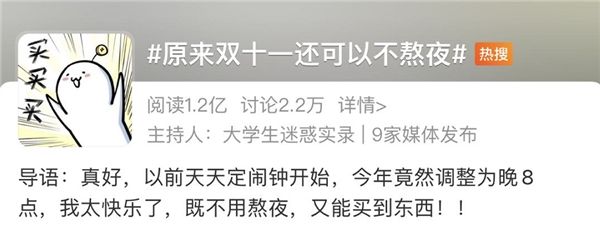 “晚8点”现象也一举成为全国各地老百姓的热议话题,大家纷纷表示双十一提前到晚8点是非常人性化的举措。在记者走访中,有上班族表示“终于可以不用加班熬夜、买东西还熬夜了”;有二胎父母表示“晚上8点的双十一才算‘节’,零点的是‘劫’”;有中老年人表示“不熬夜更健康,也能参与双十一了”;还有很多人表示“晚8点”又重燃了他们对双十一的热情。在微博社交平台,海量网友讨论的不再仅仅是买什么,更多的是热评晚8点,“原来双十一还可以不熬夜”的话题登上热搜,大家对“晚8点”的关注度可见一斑。
