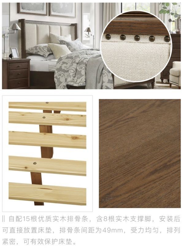 软包四周点缀有手工敲打的古咖色金属泡钉,彰显美式底蕴;斗柜抽屉处安装的古铜色金属拉手,耐腐耐磨,造型复古经典;所有抽屉导轨皆为榉木实木,承重性好,精细打磨后顺滑耐用。