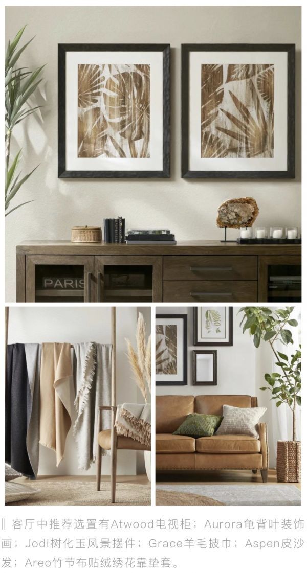 客厅中推荐选置有Atwood电视柜;Aurora龟背叶装饰画;Jodi树化玉风景摆件;Grace羊毛披巾;Aspen皮沙发;Areo竹节布贴绒绣花靠垫套。