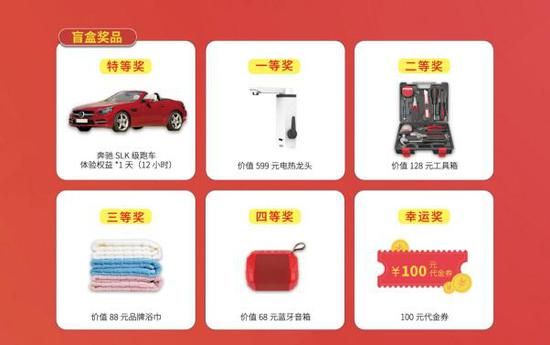除了豪华跑车试驾一天资格,盲盒内还含有电热龙头、工具箱、浴巾、蓝牙音箱、代金券这些奖品,每一个都让人很快乐,无法抗拒啊!