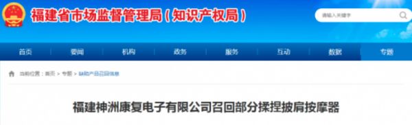 家电快讯| 福建神洲康复电子有限公司召回部分揉捏披肩按摩器