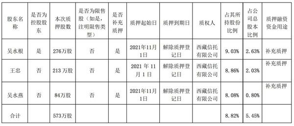 新浪门窗频道讯 11月2日,江山欧派门业股份有限公司(603208)发布关于控股股东及其他股东股份补充质押的公告。公告显示,2021年11月1日,吴水根先生、王忠先生和吴水燕女士分别将其所持有的本公司276万股、213万股和84万股无限售条件流通股补充质押给西藏信托有限公司,并于11月2日取得中国证券登记结算有限责任公司出具的《证券质押登记证明》。