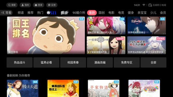 说了电影,电视剧,怎么少得了动漫,番剧。哔哩哔哩TV版上线后也是受到非常多的用户青睐,B站视频电视上也能刷,二次元体验客厅也能拉满,包括近期爆火的《国王排名》,带着孩子就能客厅一起观看这部有趣又励志新番巨作!