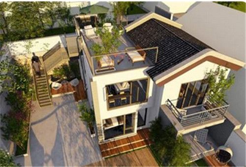 图片描述:这是一款现代风格的设计,墙面主色调为白色,再配上大面积的玻璃,则可以增加室内的采光和通风。而平屋顶+双坡屋顶的社会姐,则可以让房屋更加的大气时尚。此外庭院一侧的楼梯,可直通平屋顶,业主可以在上面种植花草和泡茶。