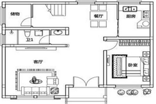 一层主要是公共活动区域和一间卧室,餐厨空间相邻设计,便于居住者就餐。将楼梯下方空间利用成储物室,提高了空间利用率。