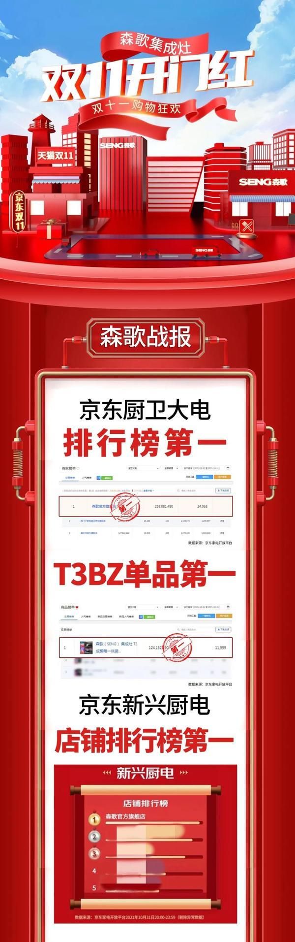 截止目前,森歌双11开门红累计销售突破1亿,T3BZ集成灶仍然毫无悬念地再次荣登京东同品类销售榜榜首,成为连续4年蝉联京东双十一同品类榜首的硬核产品。其强火力、强控烟、强排烟、66L大容量蒸箱、高温精探防火墙、900mm宽屏置物台等亮点都给足购买欲。森歌官方旗舰店也再次拿下京东厨卫大店榜榜首、新兴厨电榜榜首!