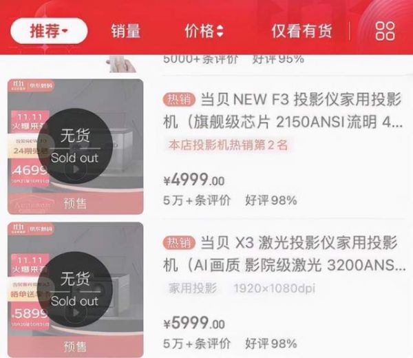 像今年高端爆品的当贝X3激光智能投影仪和当贝NEWF3高端旗舰家用投影仪,在今年双十一开门红,全网各个销售平台直接卖断货无货,用户消费者抢售一空,一机难抢。