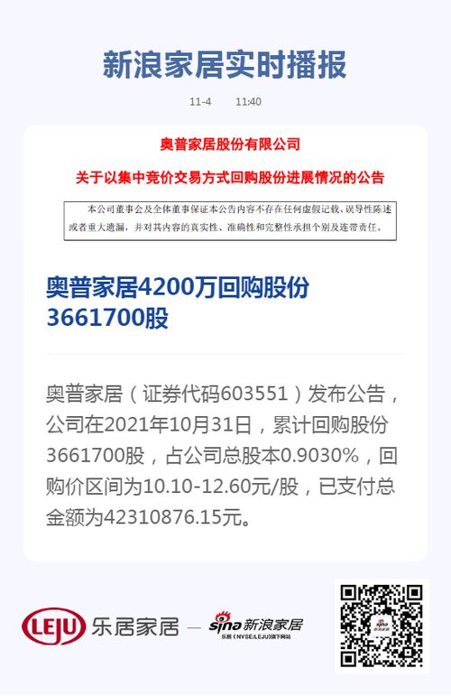 奥普家居(证券代码603551)发布公告,公司在2021年10月31日,累计回购股份3661700股,占公司总股本0.9030%,回购价区间为10.10-12.60元/股,已支付总金额为42310876.15元。