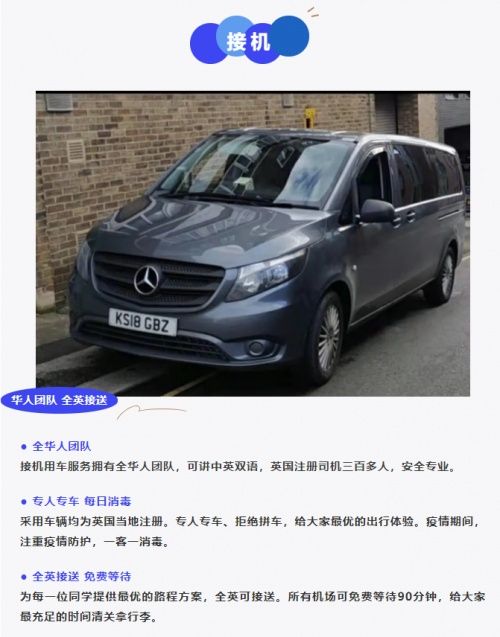 为了让留学生落地英国后能够更安全、更省心的地入住到预定好的公寓住房,汉伦联合BUNNY CARE,层层筛选持英国驾照、驾龄10年以上、经验丰富的老华人司机为留学生提供接机服务,并且司机团队皆也都严格执行疫情防控措施——佩戴口罩、做好消杀工作。除此之外,他们还附带行李搬运、机场等候等多项免费服务,全方位为便利留学生的便利而考虑。