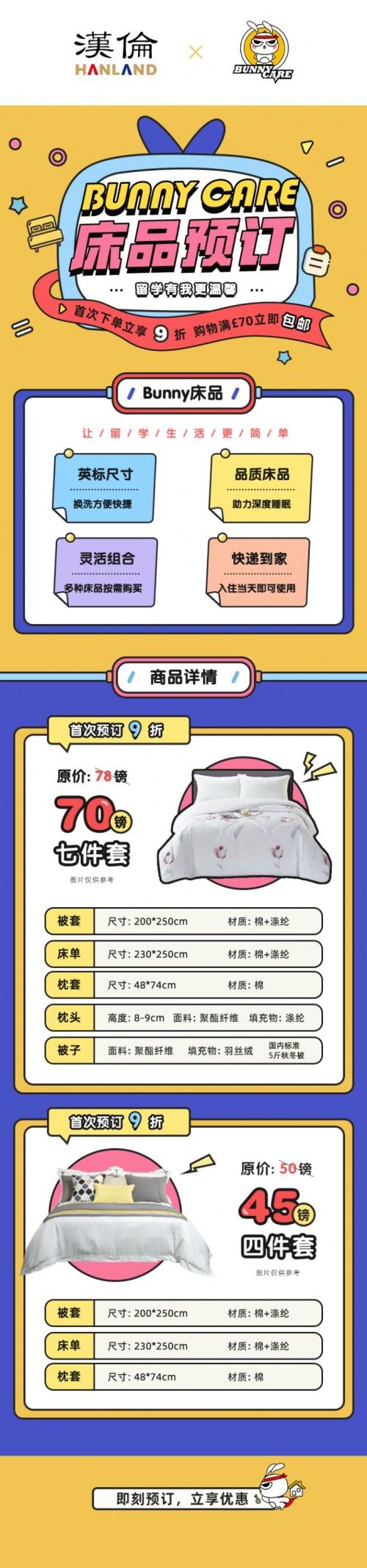 除了接机服务之外,汉伦还联手BUNNYCARE为留学生提供床品预定服务。不管不论是英标尺寸的设计选择、,还是品质床品推荐、和灵活组合需求,或是快递到家、当天即可使用等周到的服务考虑,汉伦都会尽可能地满足每个人的需求。值得一提的是,首单预定在汉伦预订还可享受9折福利,而且床上用品七件套仅需70镑,四件套仅需45镑。