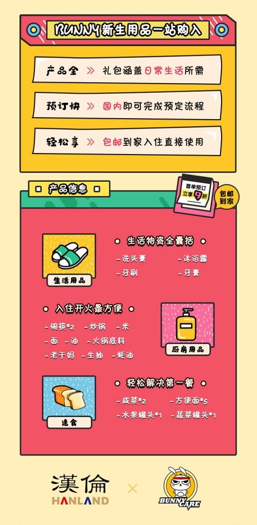 汉伦牵手BUNNYCARE还为留学新生提供了新生用品一站快捷购入的服务。其服务的最大特色就在于:产品全、预订快、配送及时。不管是洗头套、沐浴露、牙刷、牙膏等日常生活用品,还是碗筷、炒锅、米面、调味品等厨房用品,或者是方便面、咸菜、水果罐头、蔬菜罐头等速食,都能在国内即可完成预定流程,并且快速包邮到家,确保学生入住后可直接使用。