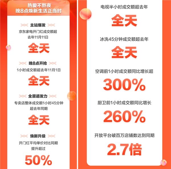 从数据上看,京东家电开门红成交额超去年11月11日全天!10月31日晚8点付尾款开场仅1小时,京东家电成交额即超过去年11月1日全天!在品类表现方面,电视开场半小时成交额超去年11月1日全天;冰洗45分钟成交额超去年11月1日全天,冰洗4小时预售尾款金额占整体成交额超过60%;空调1小时成交额同比去年11月1日00:00-01:00(以下1小时同比对比维度相同)增长超3倍,万元以上空调成交额同比增长270%;厨卫1小时成交额同比增长260%;开放平台小家电1小时成交额超千万店铺同比去年数量增长100%;开放平台大家电前4小时500家以上店铺成交额同比增长超300%。