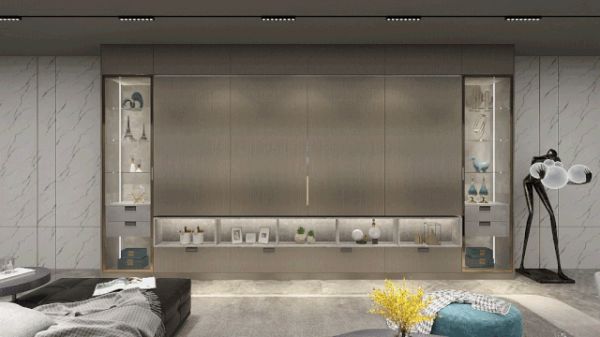 领尚电视柜莱茵河畔通过利用墙面空间进行“一柜到顶”设计,实现收纳升级。柜体内设有电视摆放区、装饰品摆放区,可轻松容纳日常物品。此外,该柜体还采用电动遥控门板设计,可是实现外观大变身,让物品藏于无形。通过灰色门板利落简练的线条引导,让客厅空间有了高雅而舒适的氛围。