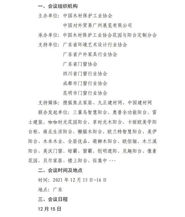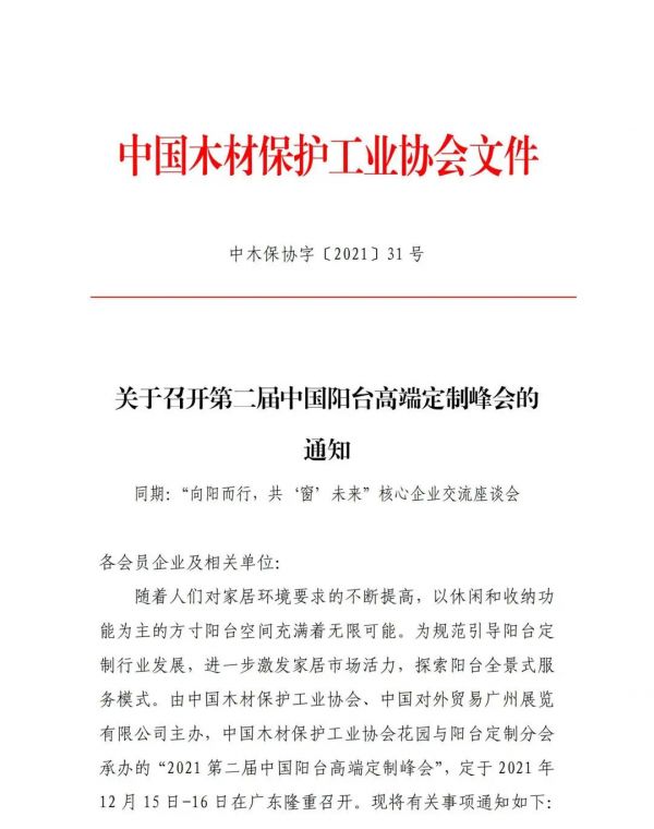 新浪家居设计频道讯 11月3日,中国木材保护工业协会官方发布《关于召开第二届中国阳台高端定制峰会的通知》。通知指出,为规范引导阳台定制行业发展,进一步激发家居市场活力,探索阳台全景式服务模式,中国木材保护工业协会将与中国对外贸易广州展览有限公司于2021年12月15日-16日在广东隆重召开“2021第二届中国阳台高端定制峰会”。