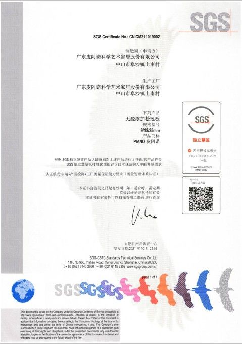 皮阿诺无醛添加松冠板获SGS颁发“无醛认证证书”