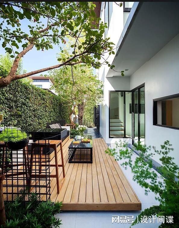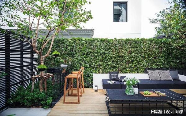 庭院中设计了休息区域,背后设计了树墙做装饰,搭配黑色的桌子茶几,辅助木色的地板