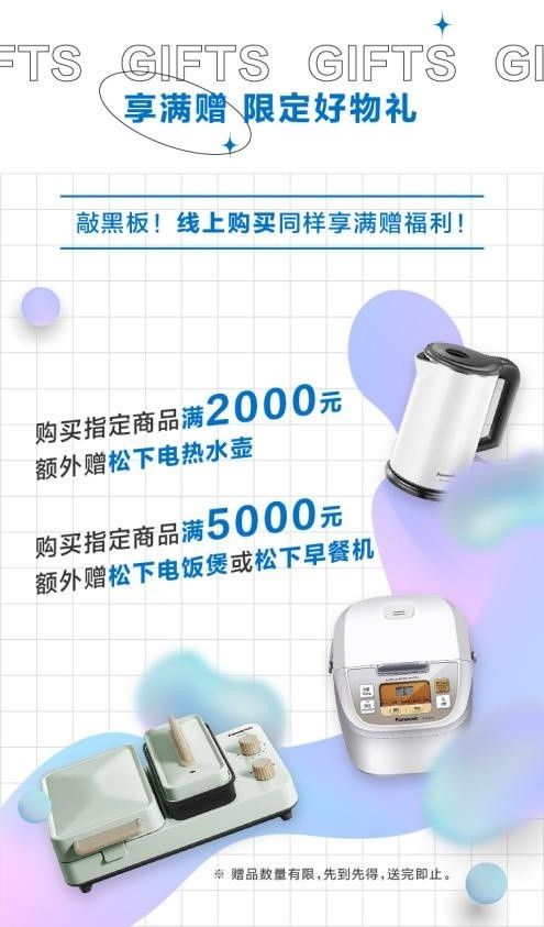 此外,线上购买还可同样享受满赠福利!购买指定商品满2000元额外赠松下电热水壶,购买指定商品满5000元额外赠送松下电饭煲或松下早餐机。