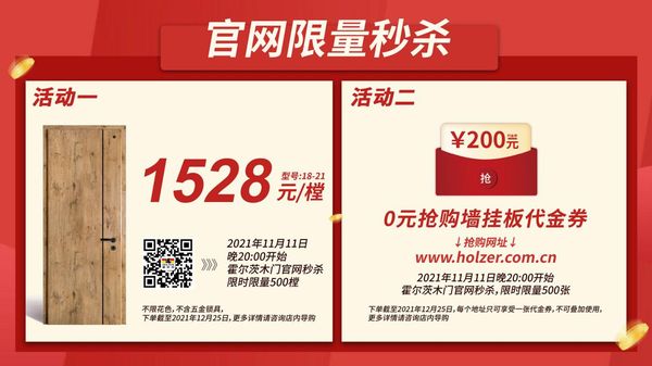 随着一年一度的双十一购物狂欢节的来临,T型门品牌霍尔茨悍然出击,以空前的钜惠力度,线上线下同时开放抢购,让利于霍尔茨忠实消费者!本次双十一霍尔茨拿出满满诚意:2021年11月11日晚20点,霍尔茨木门官网(www.holzer.com.cn)将开启1528元/樘的劲爆抢购,限时限量秒杀500樘T型门18-21(不限花色,不含五金件),同一时间开启0元抢购200元墙挂板代金券,全场限量500张,多种组合优惠叠加,购置霍尔茨产品价格便可优惠再优惠,享受惊艳福利。