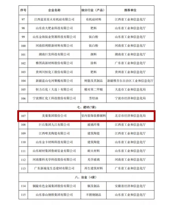 中华人民共和国工业和信息化部发布了工业产品绿色设计示范企业(第三批)公示名单,本次评选囊括了全国电子电器、机械装备、建材等八大领域的117家优秀企业,美巢集团凭借在产品绿色设计方面所取得的卓越成绩荣登榜单,成为北京市唯一上榜的建材企业。