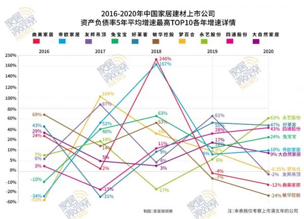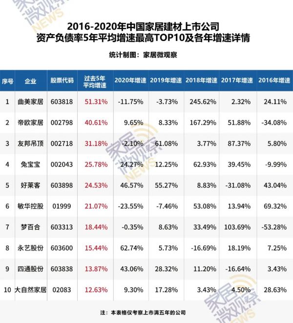 过去5年资产负债率平均增速最高的10家公司分别为:曲美家居、帝欧家居、友邦吊顶、兔宝宝、好莱客、敏华控股、梦百合、永艺股份、四通股份、大自然家居(已退市)。